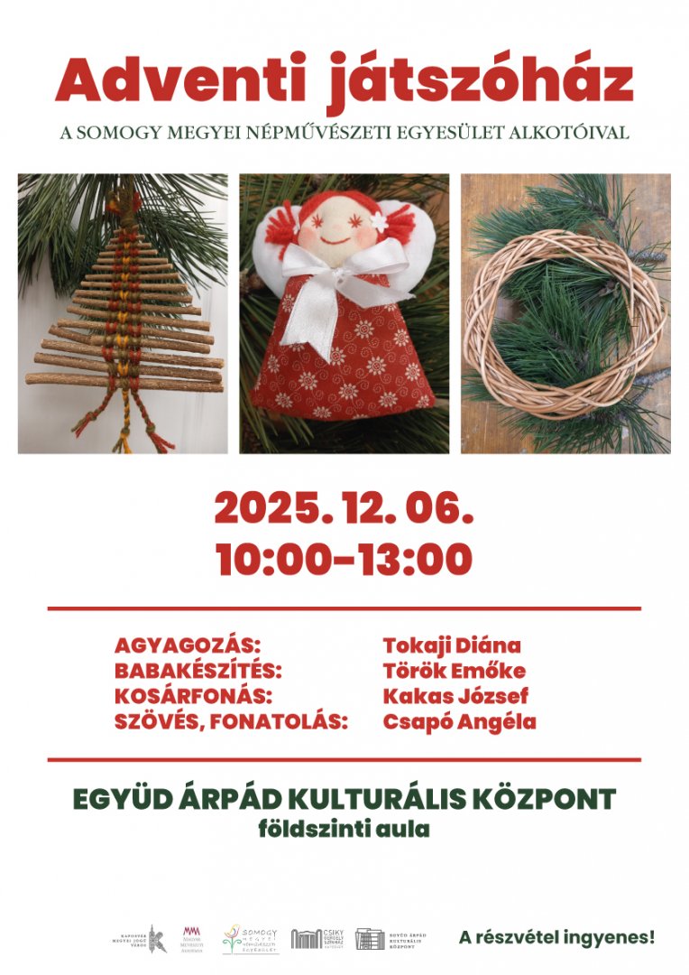 A Kaposvári Agórában 2025.december 6-án 10-től 13-óráig várjuk az érdeklődőket adventi kézműves foglalkozásainkra.